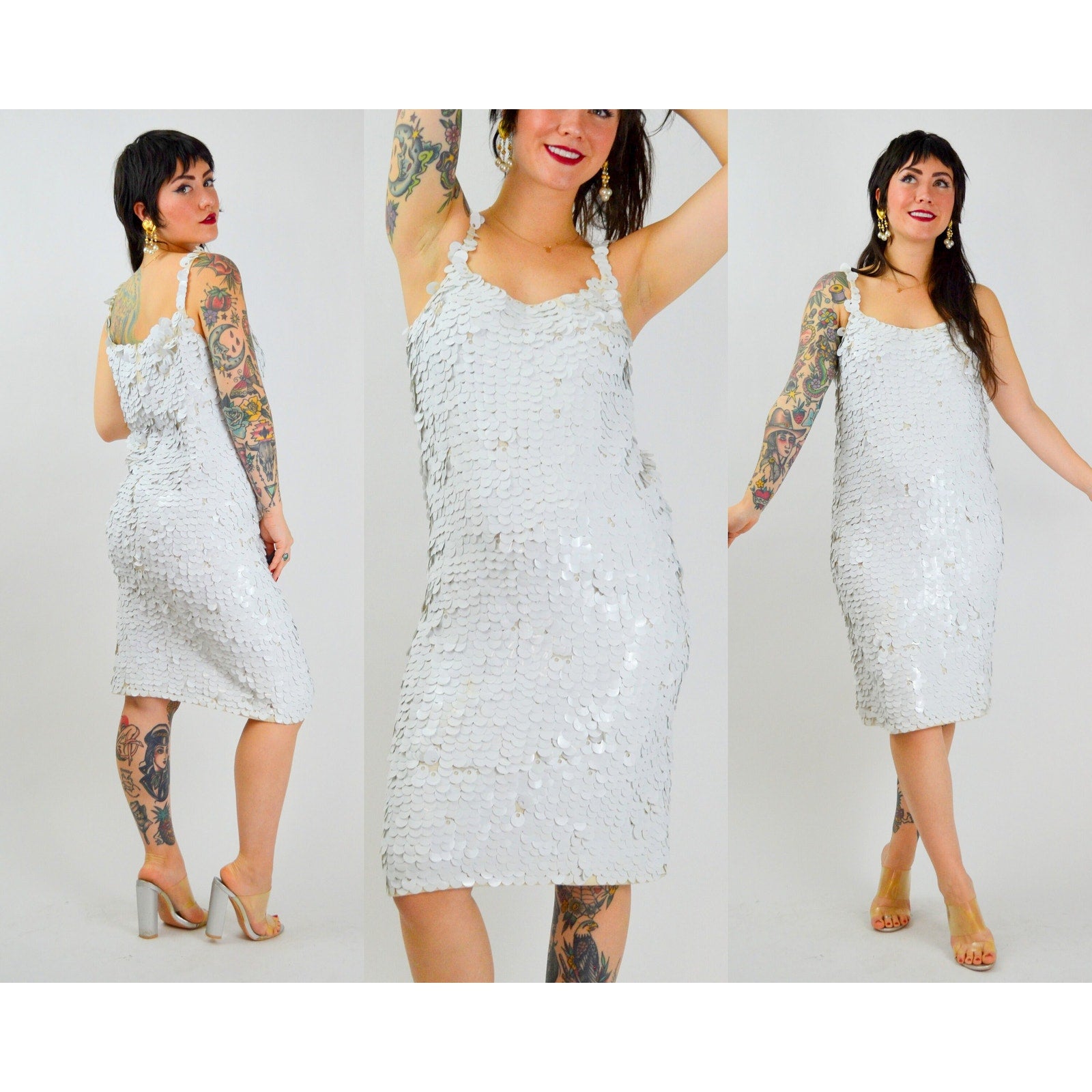 Very Good Vintage Condition: Structurally, this dress is in gorgeous condition and is very wearable with tons of shimming life left in it! The only real issue to note here is that some of the paillettes have fallen off and are missing from over the decades. ( probably long lost on many groovy dance floors , RIP ♥) So there are some spots randomly throughout that are missing a few that leave little unfilled patches. Some of the paillettes do have some bends and creases, this could happen from being folded improperly or bending in a funny way. And finally some of the paillettes has some slight color transfers and spots on them. All very minor and do not take away from the true uniqueness and how special this dress is, priced accordingly. ♥