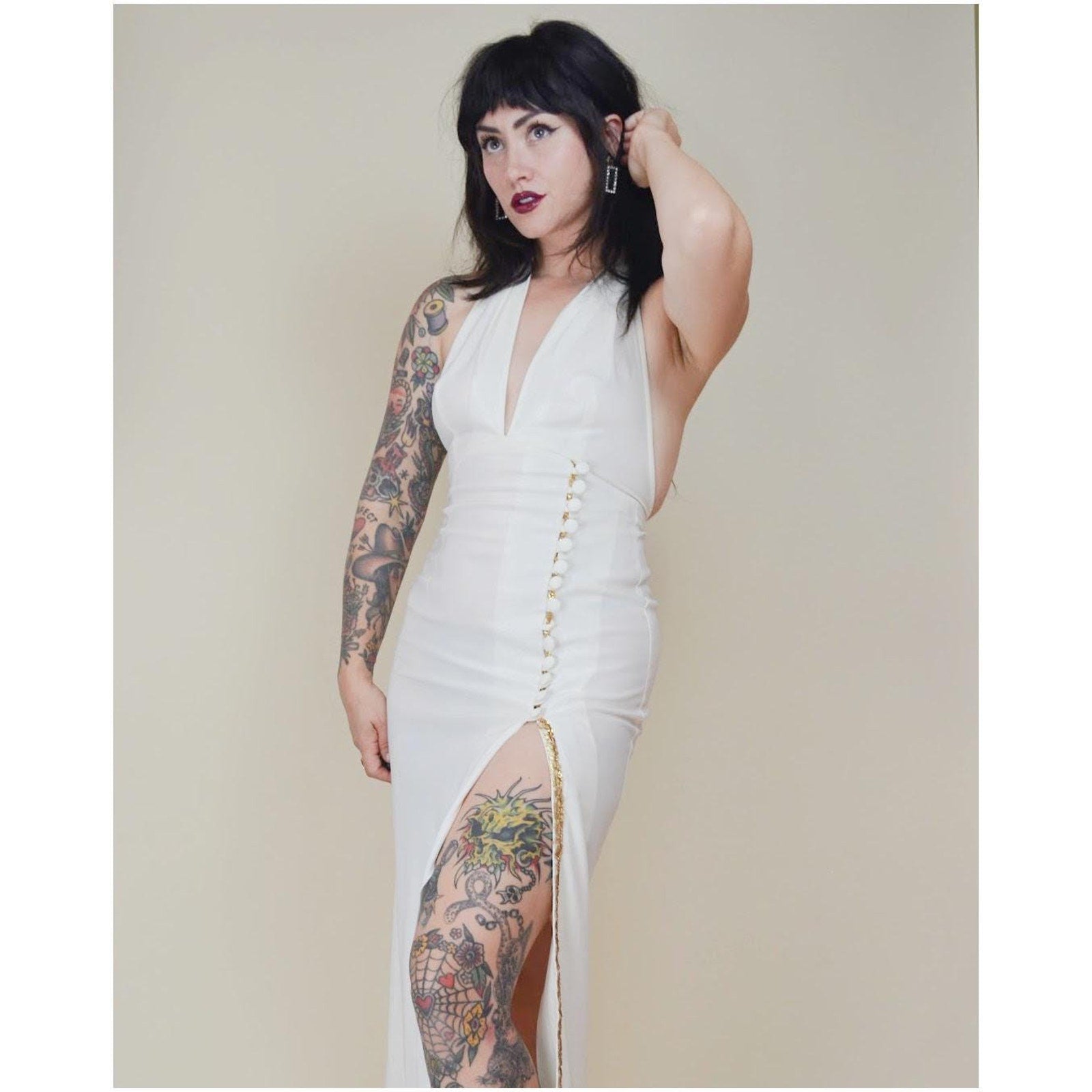 1970s XS FREDERICK'S of HOLLYWOOD Halter Dress – Vintage White Cocktai Dress Deep V Neckline