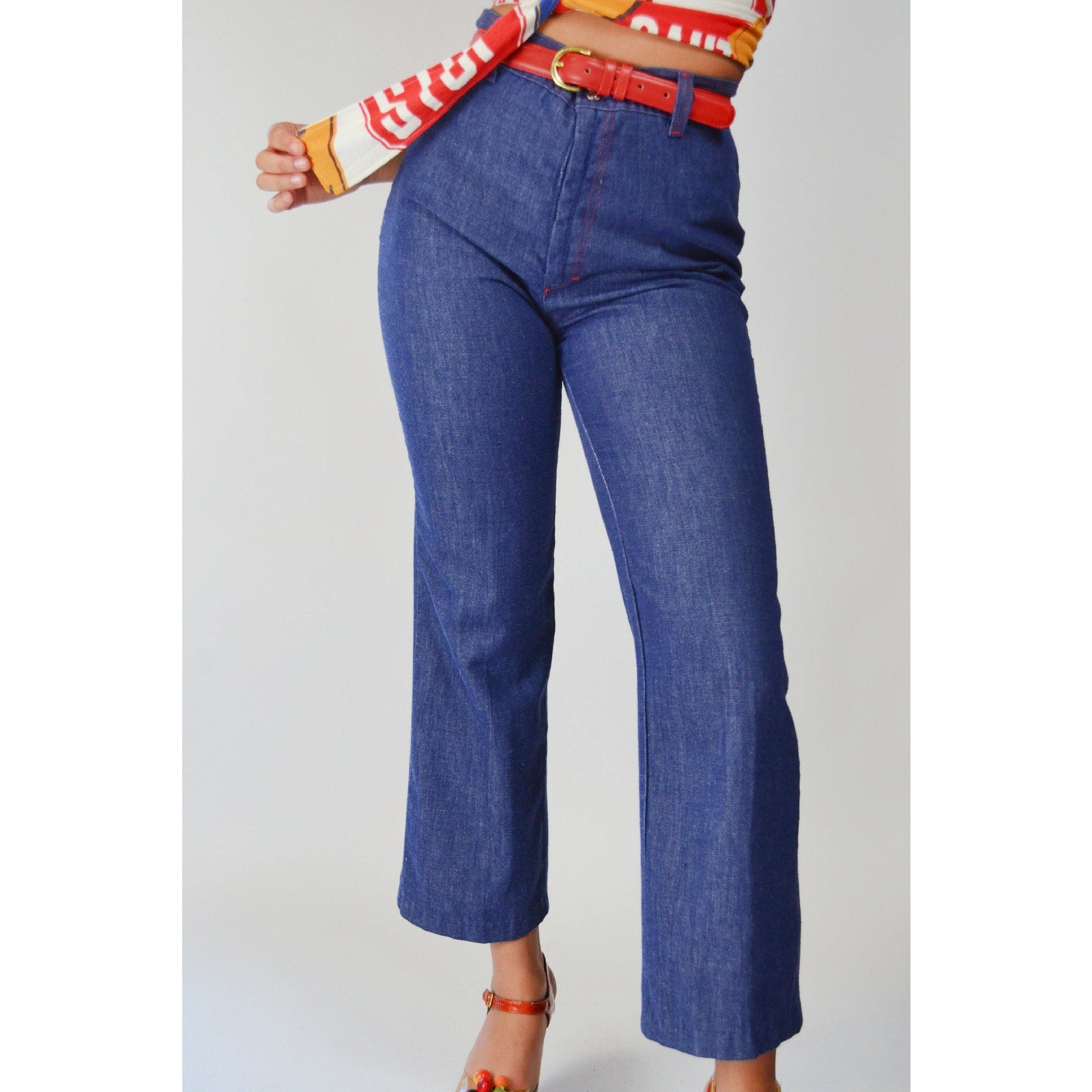 So cool! 1970's hand embroidered jeans. Kliban cat is stitched on the back pocket. High rise fit, button and zipper closure. Unlined. Straight leg fit with a slight flare. These dark denim vintage cuties are a must have.