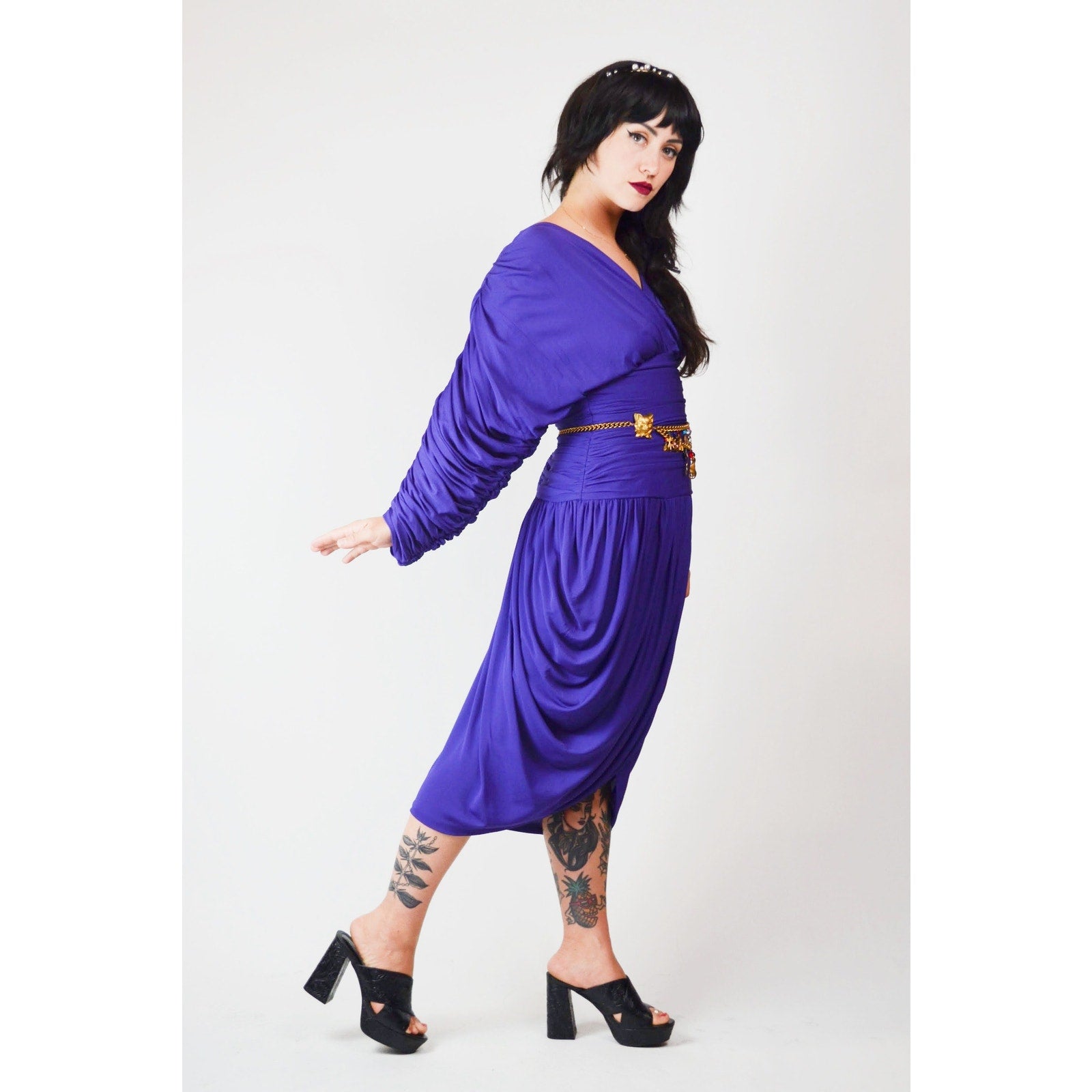 1980s Medium VICKY TIEL Dress – Vintage Purple Designer Ruched Draped Tulip Skirt Cocktail Dress
