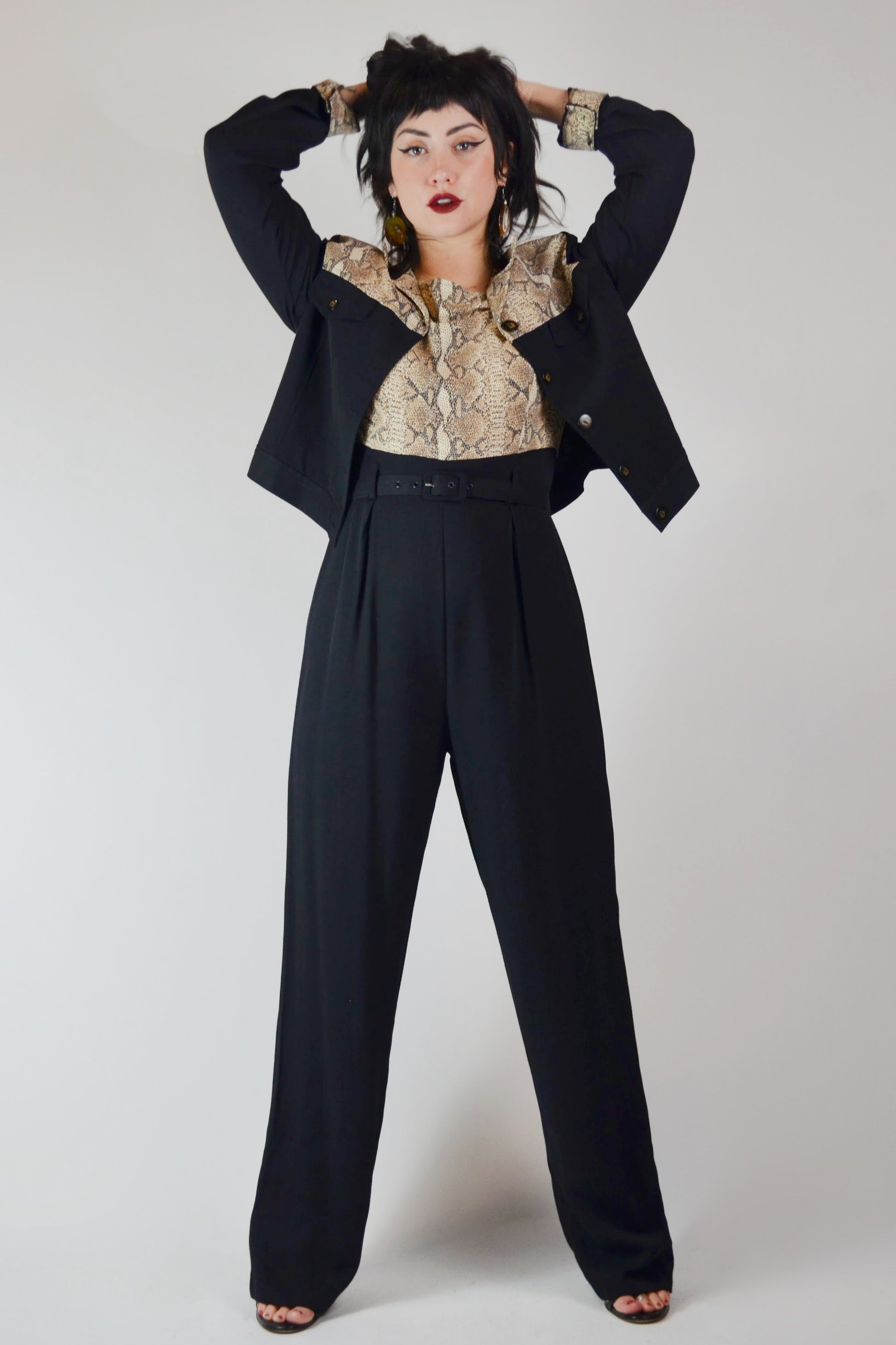 Made in a black rayon material with contrasting snake print details. The jacket can be taken off, revealing the snake print bodice of the jumpsuit. Original black waistbelt is included. Center back zipper on jumpsuit, button closure on jacket. Both items are unlined.