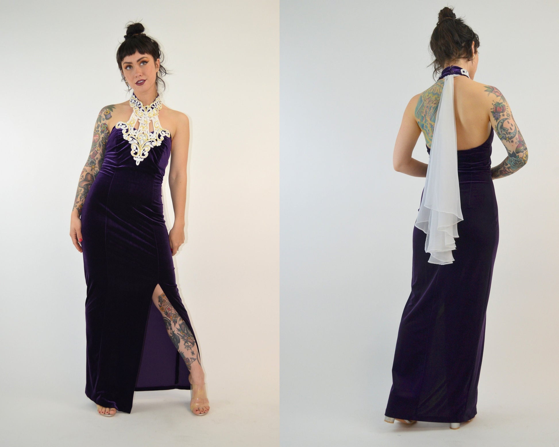 SMALL 1990s Velvet Maxi Dress Vintage Halter Dress 90s Prom Dress Fitted Purple Velvet